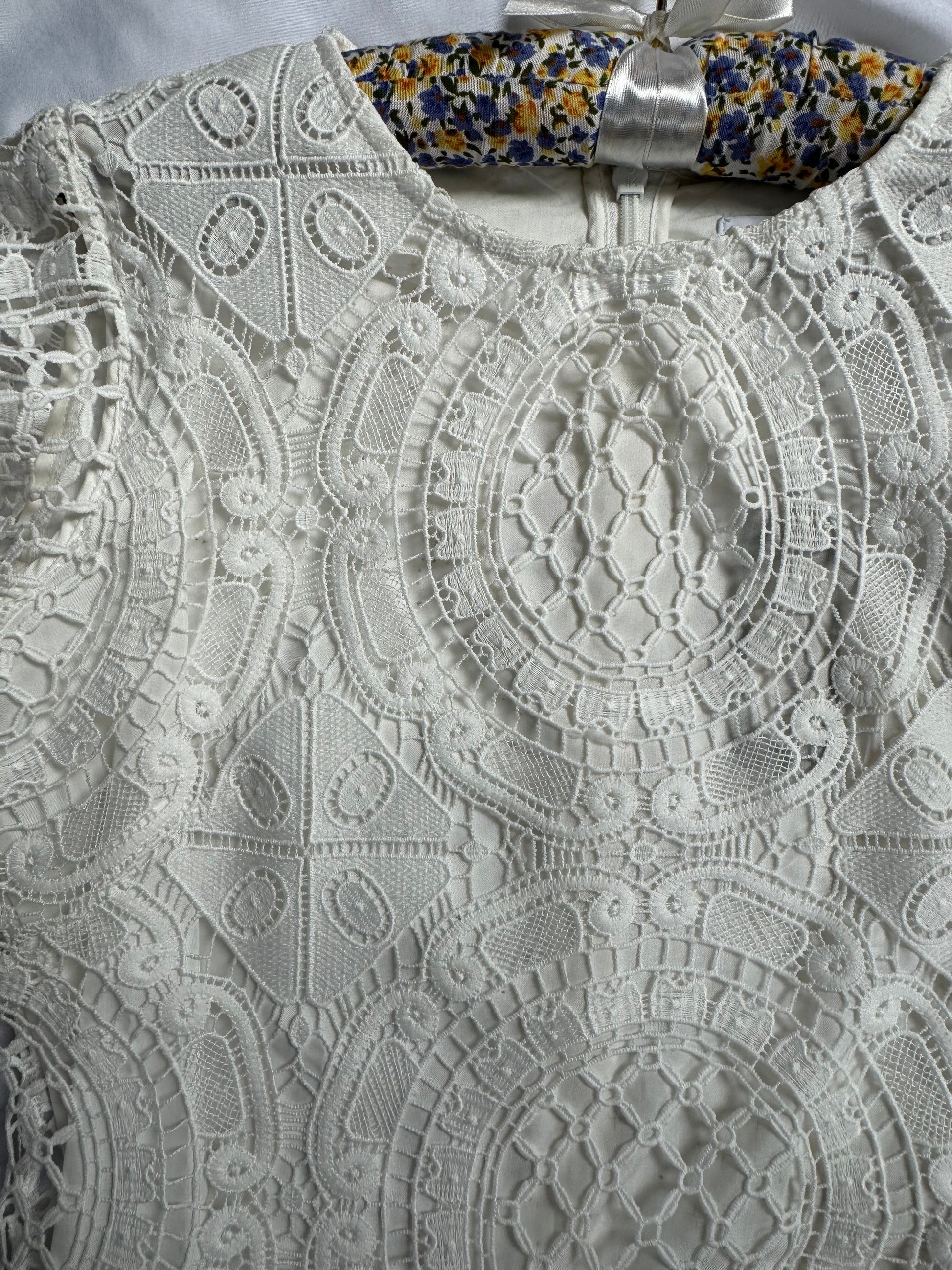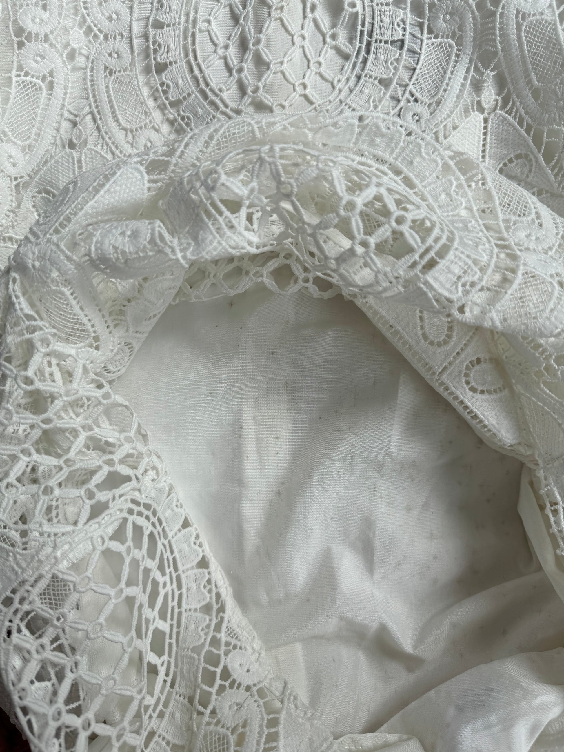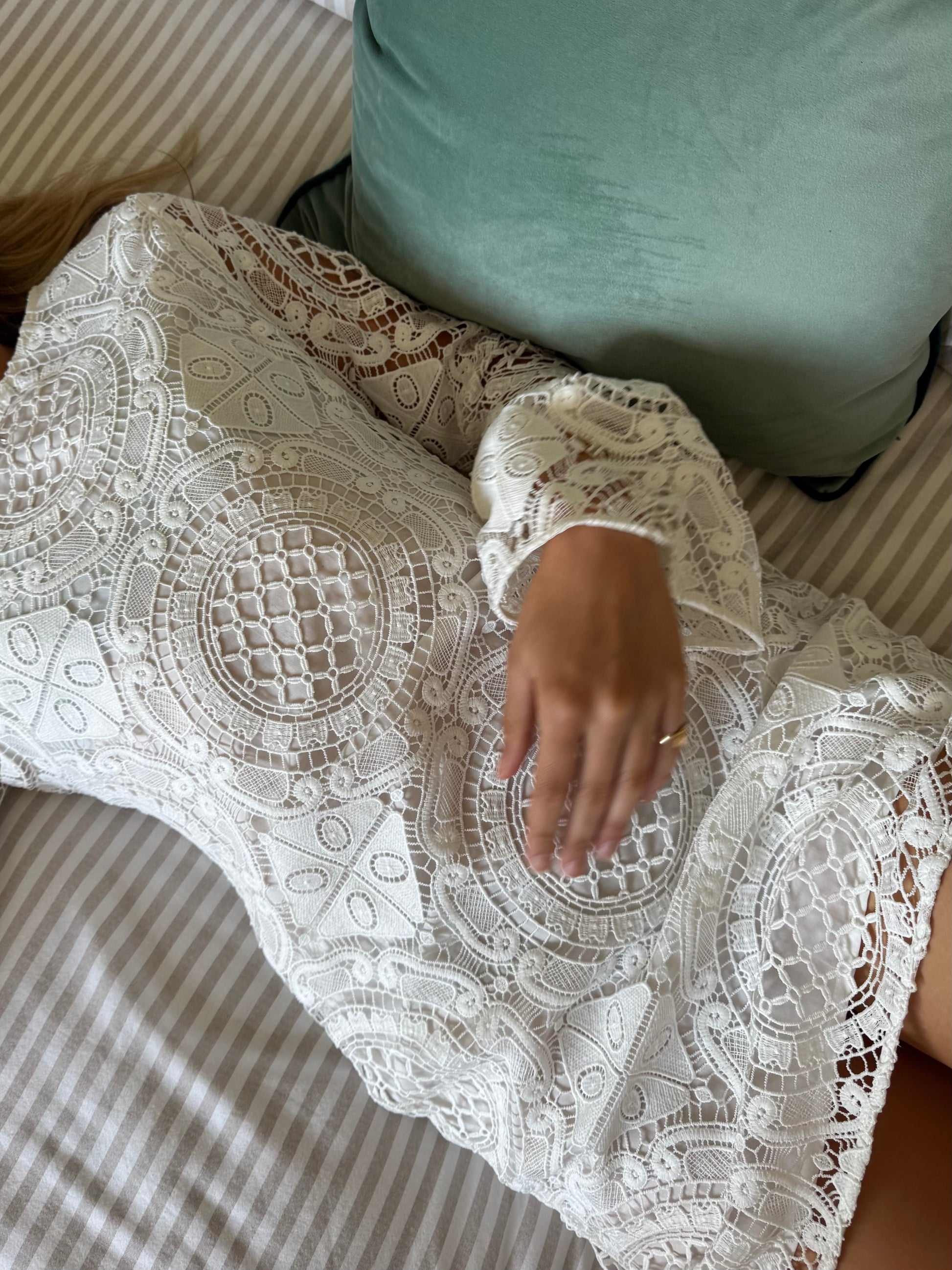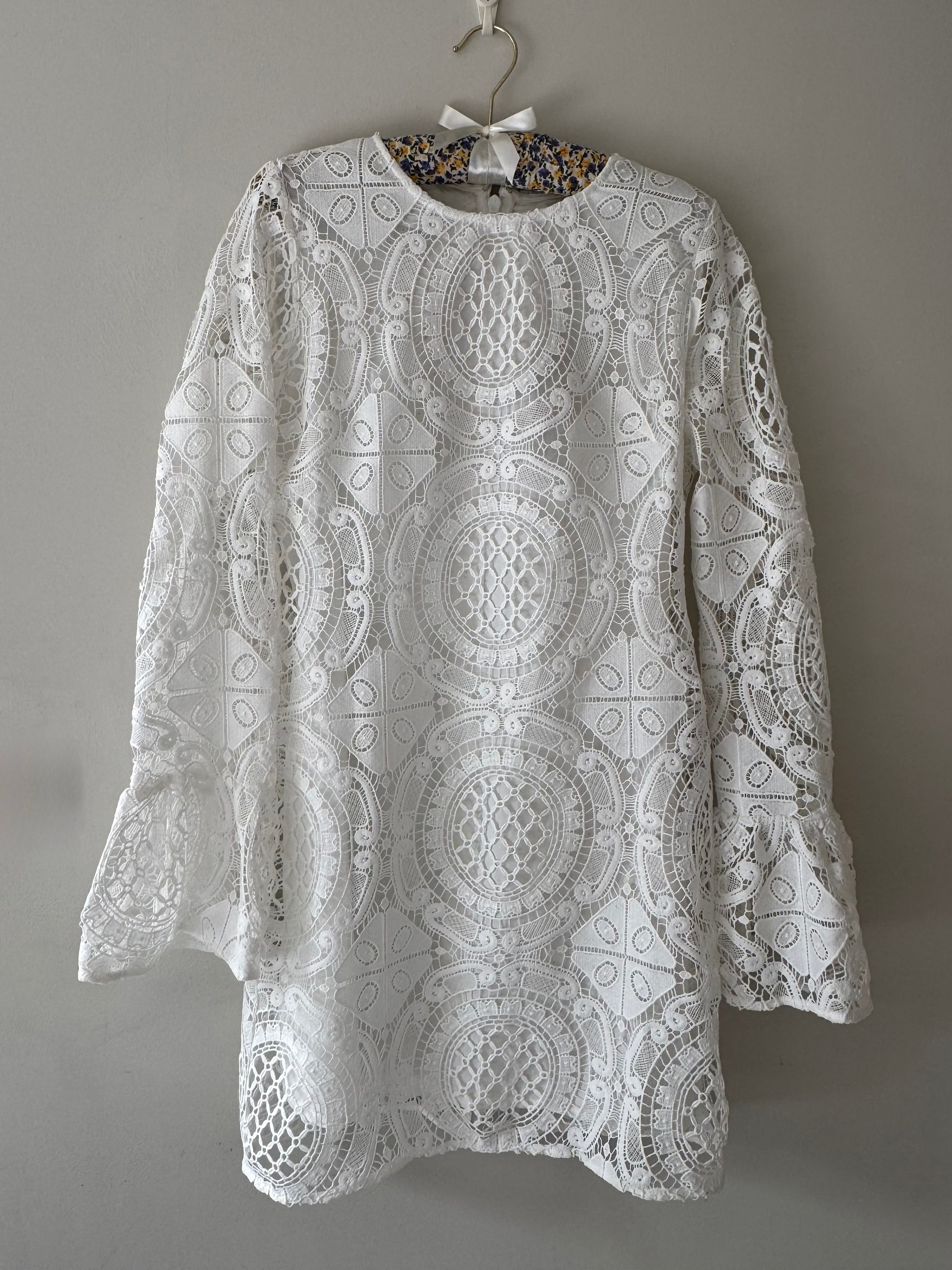 Turn heads in this stunning white lace mini dress, featuring intricate circular crochet patterns and dramatic bell sleeves for a bold boho vibe. The fitted silhouette and sheer sleeves add a flirty touch, while the soft lining keeps it comfortable and wearable.