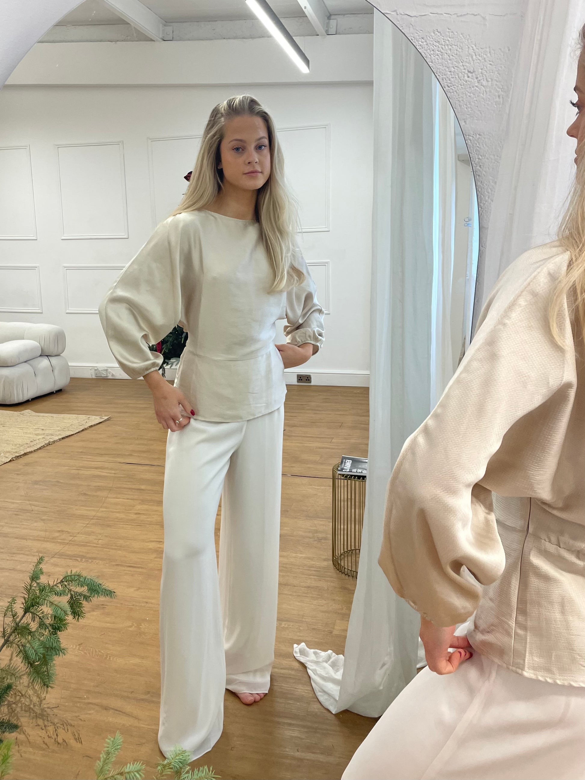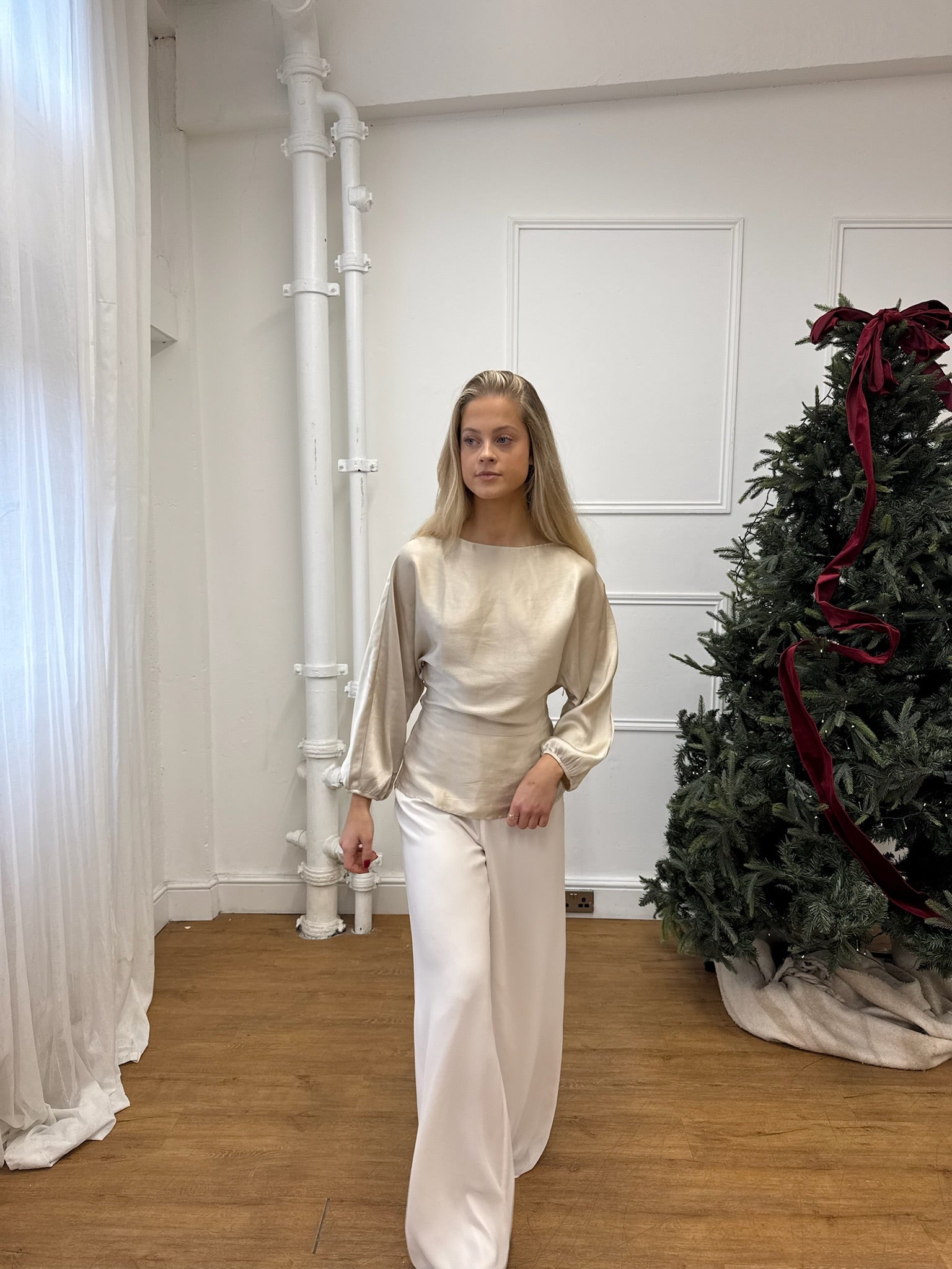 A soft, champagne-toned top that brings subtle holiday shimmer to any look. Featuring a relaxed silhouette with a gentle cinched waist, it drapes effortlessly for Christmas dinners or New Year’s soirées—elegant, understated, and beautifully festive.