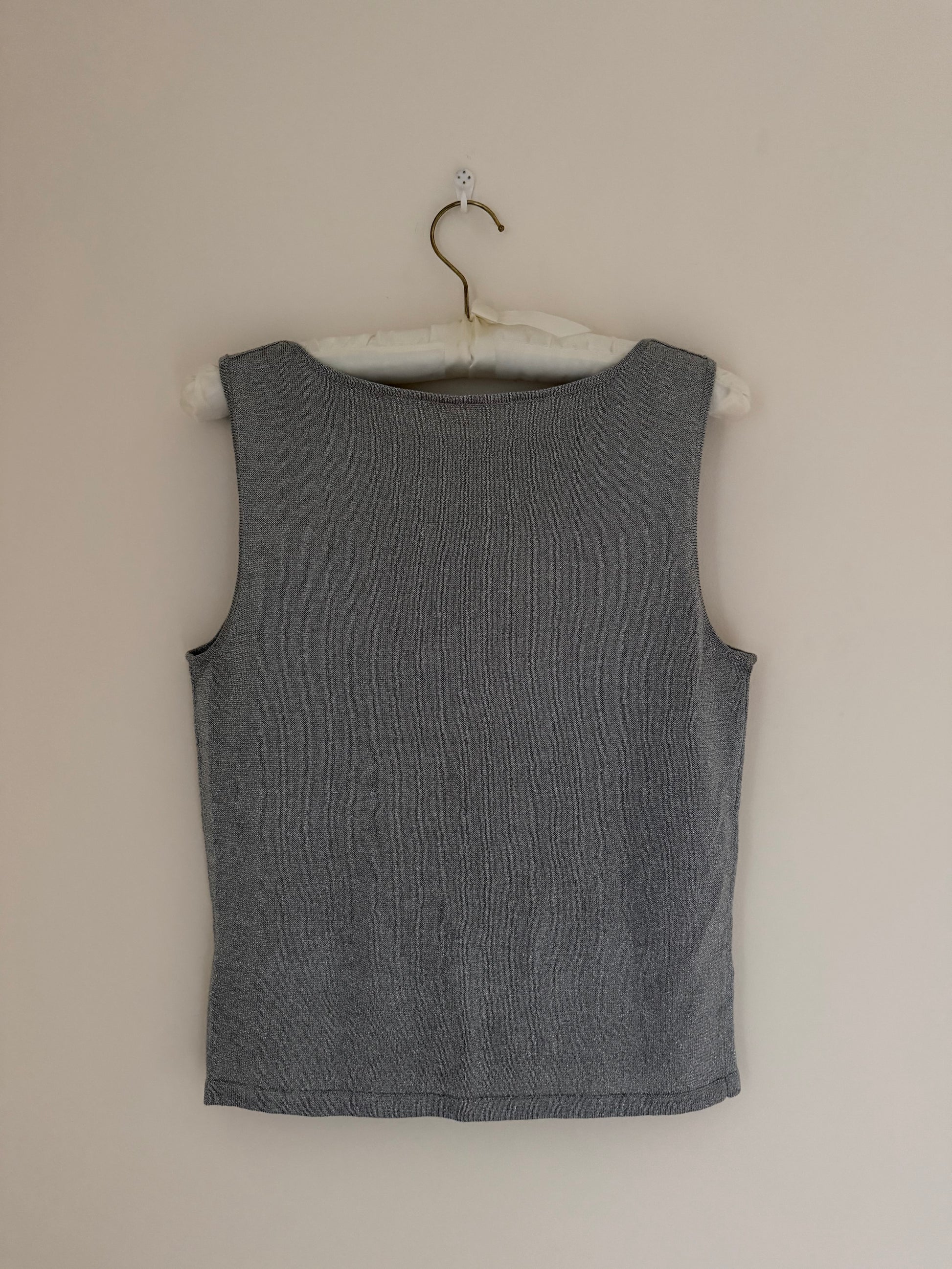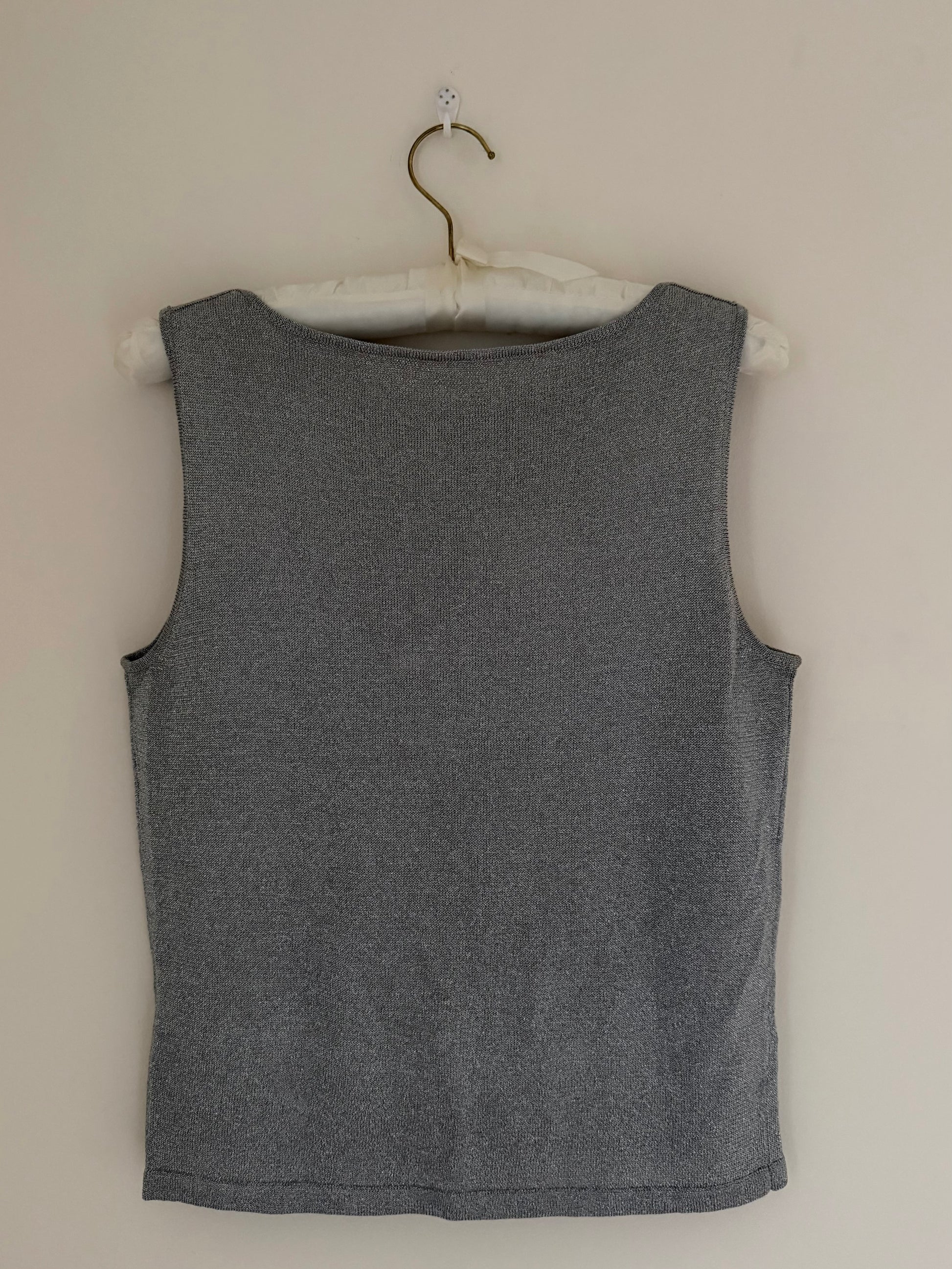 Shimmer through the season in the Halo Sparkle Top Crafted from a soft silver knit with a subtle metallic sheen, this sleeveless piece catches the light beautifully for an effortless festive glow. Perfect for pairing with satin trousers or layering under a blazer for a sleek, timeless party look.
