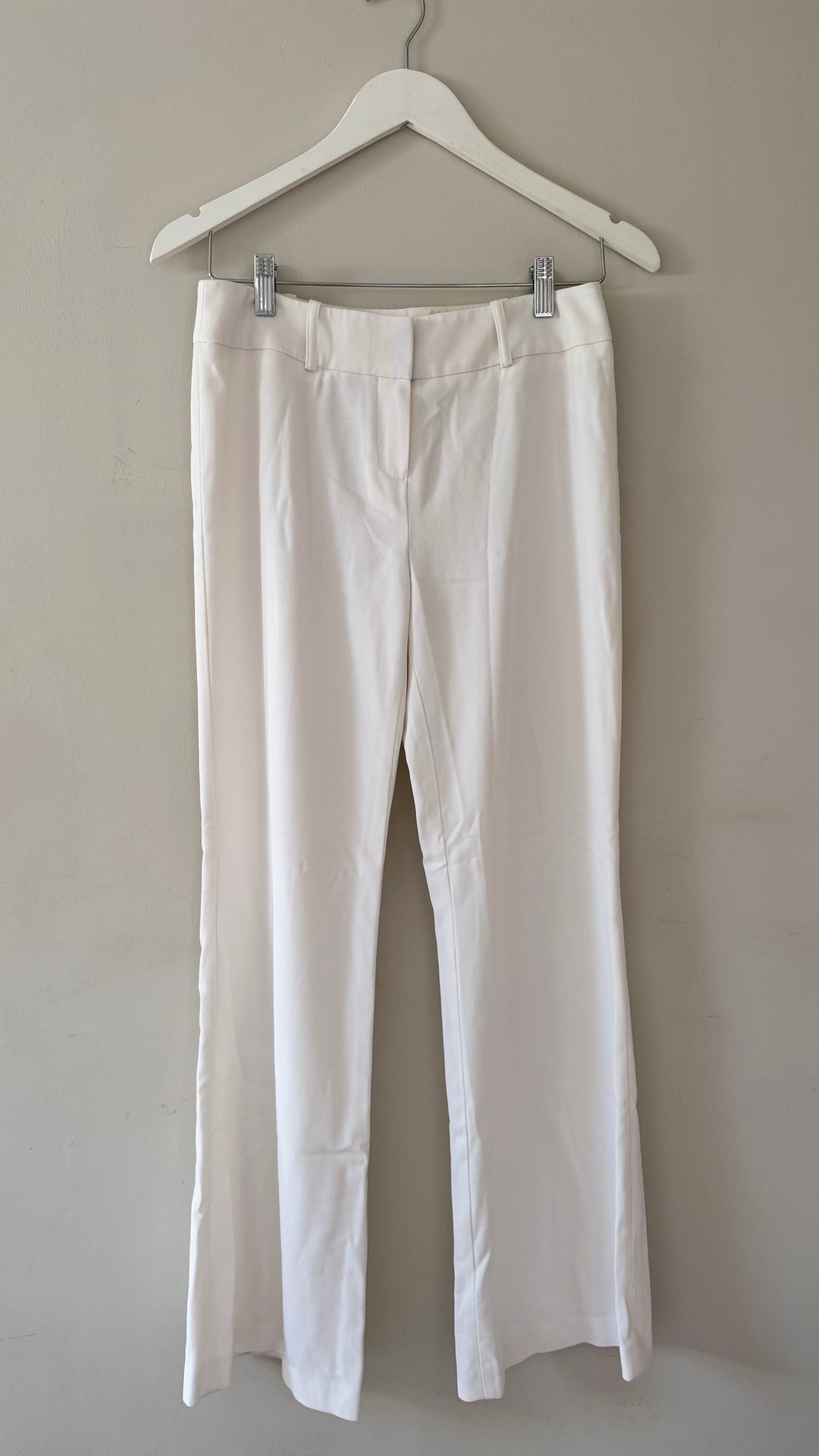 These classic white trousers offer a clean, tailored look perfect for both work and casual wear. Featuring a flattering mid-rise waist, subtle flare, and belt loops for added versatility, they bring effortless elegance to any outfit. A wardrobe essential for timeless style.