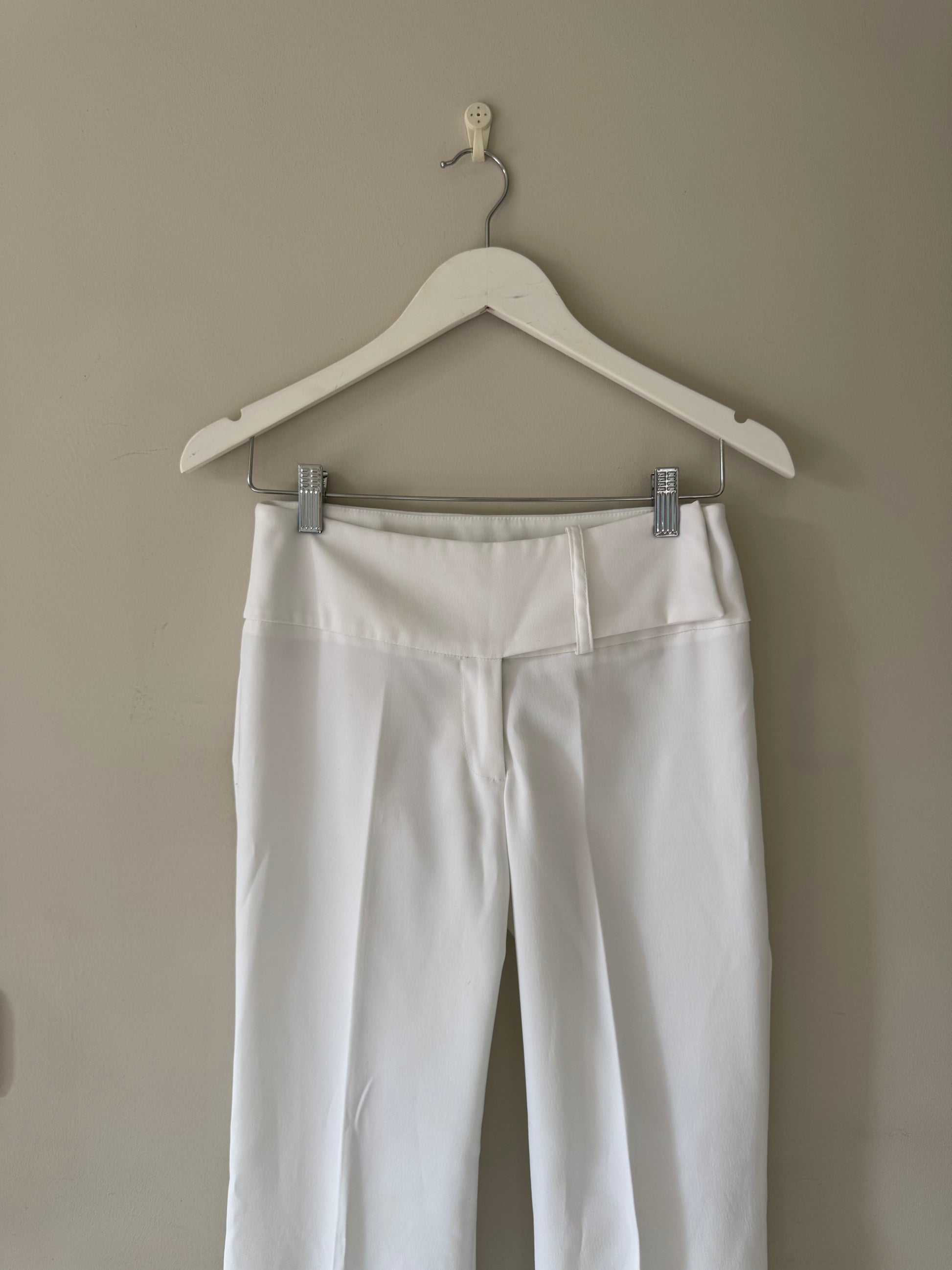 Step into sleek sophistication with these low-rise white suit trousers. Designed with a tailored fit and subtle flare at the hem, they offer a modern twist on a classic silhouette. The crisp white fabric adds a polished finish, perfect for professional settings or elevated casual looks.