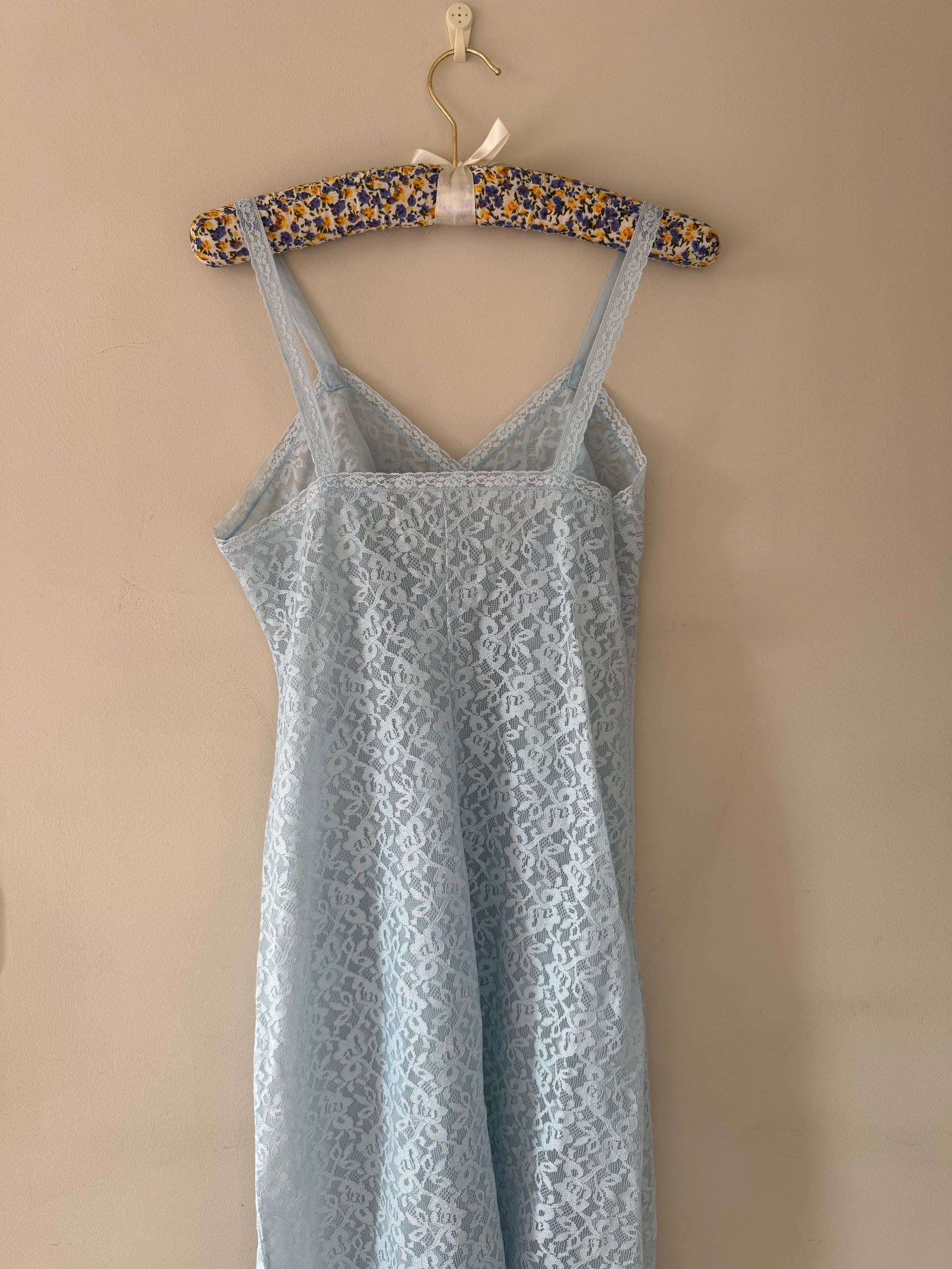 Delicate and dreamy, this vintage-inspired slip dress features soft powder blue lace, a flattering V-neckline, and adjustable spaghetti straps. Perfect for layering or lounging in timeless elegance.