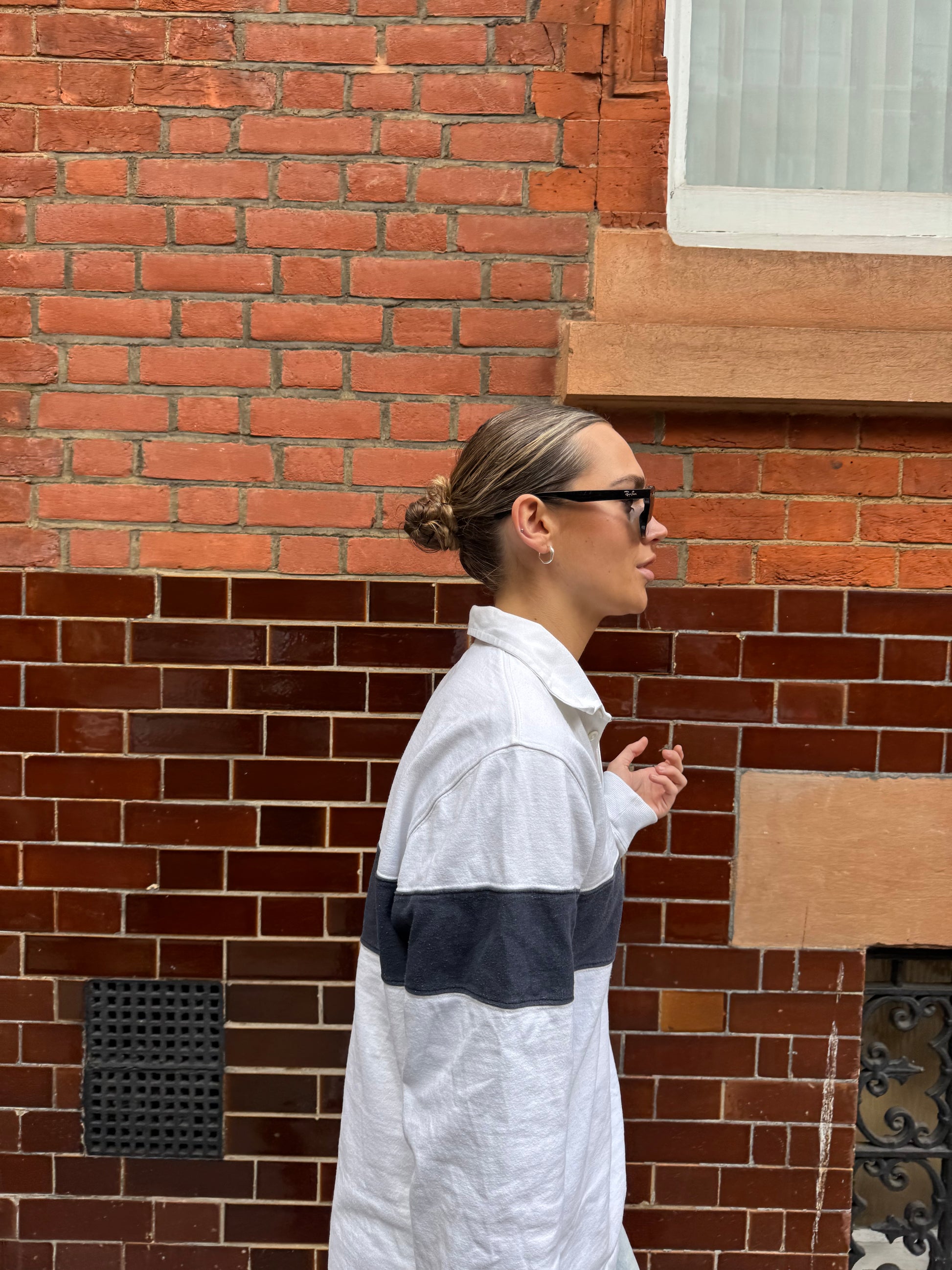 Classic white rugby shirt with a bold navy stripe across the chest. Features a collared neckline with button placket and a relaxed fit. Style with jeans and loafers for a chic model off duty look!