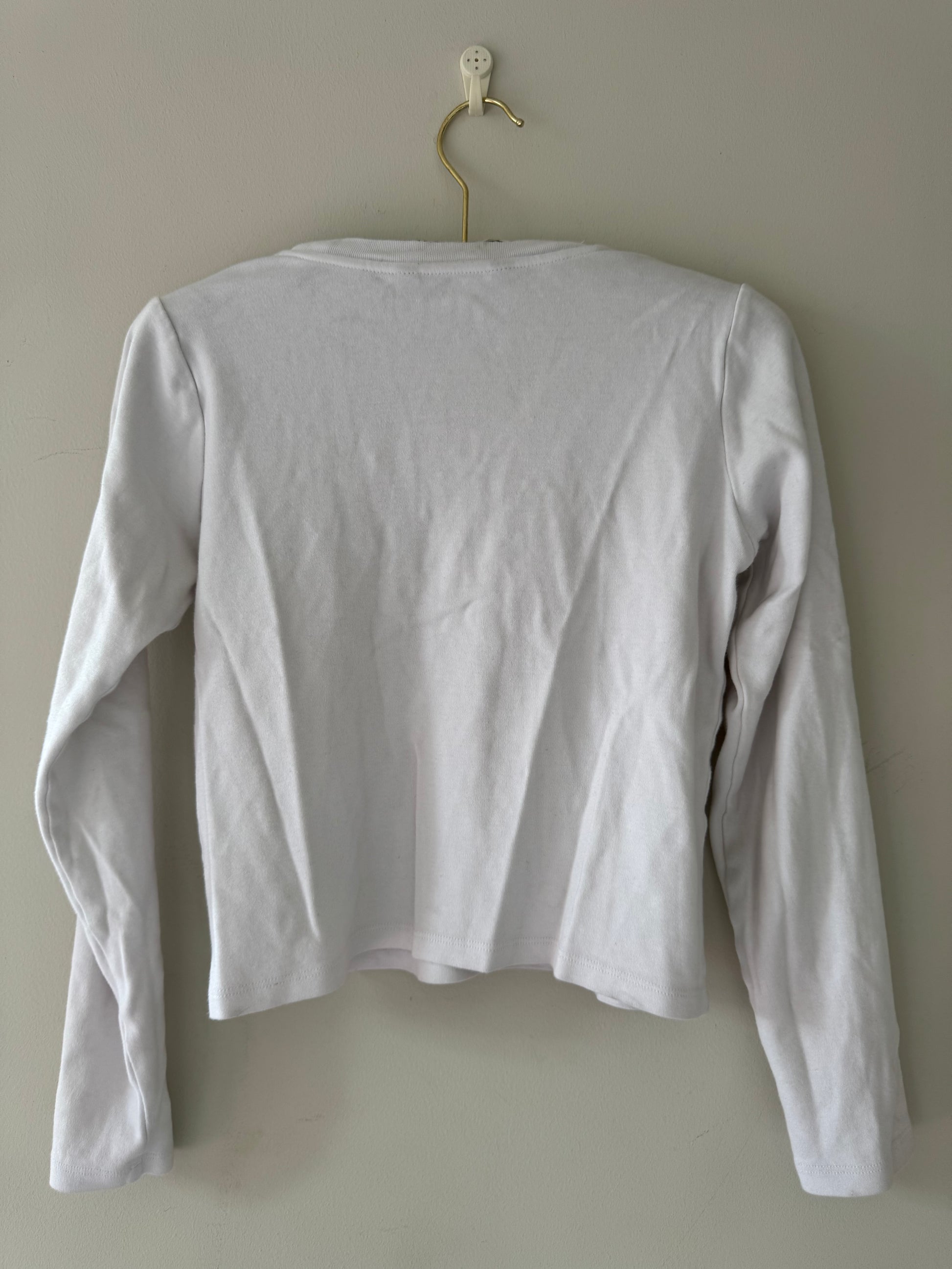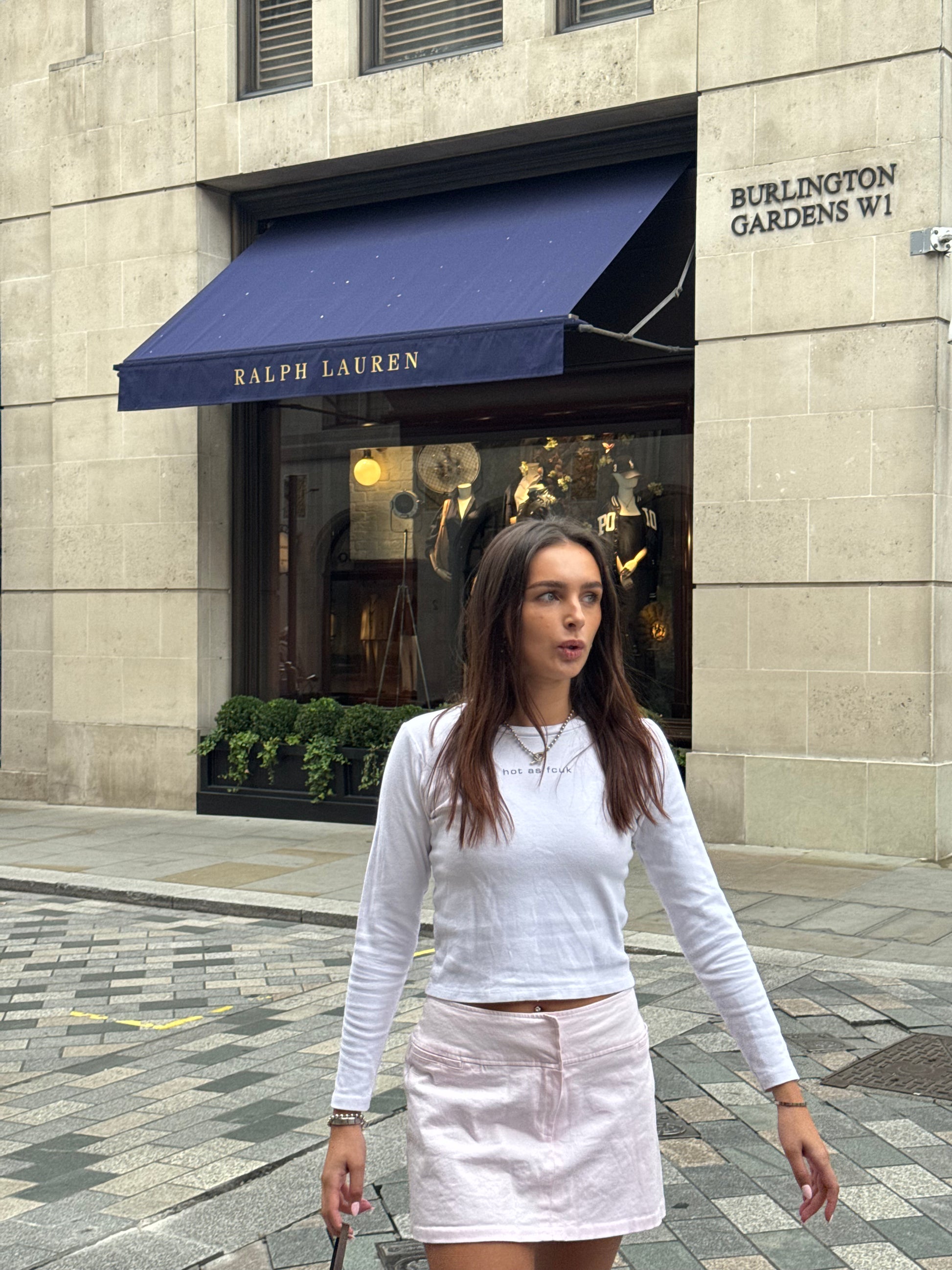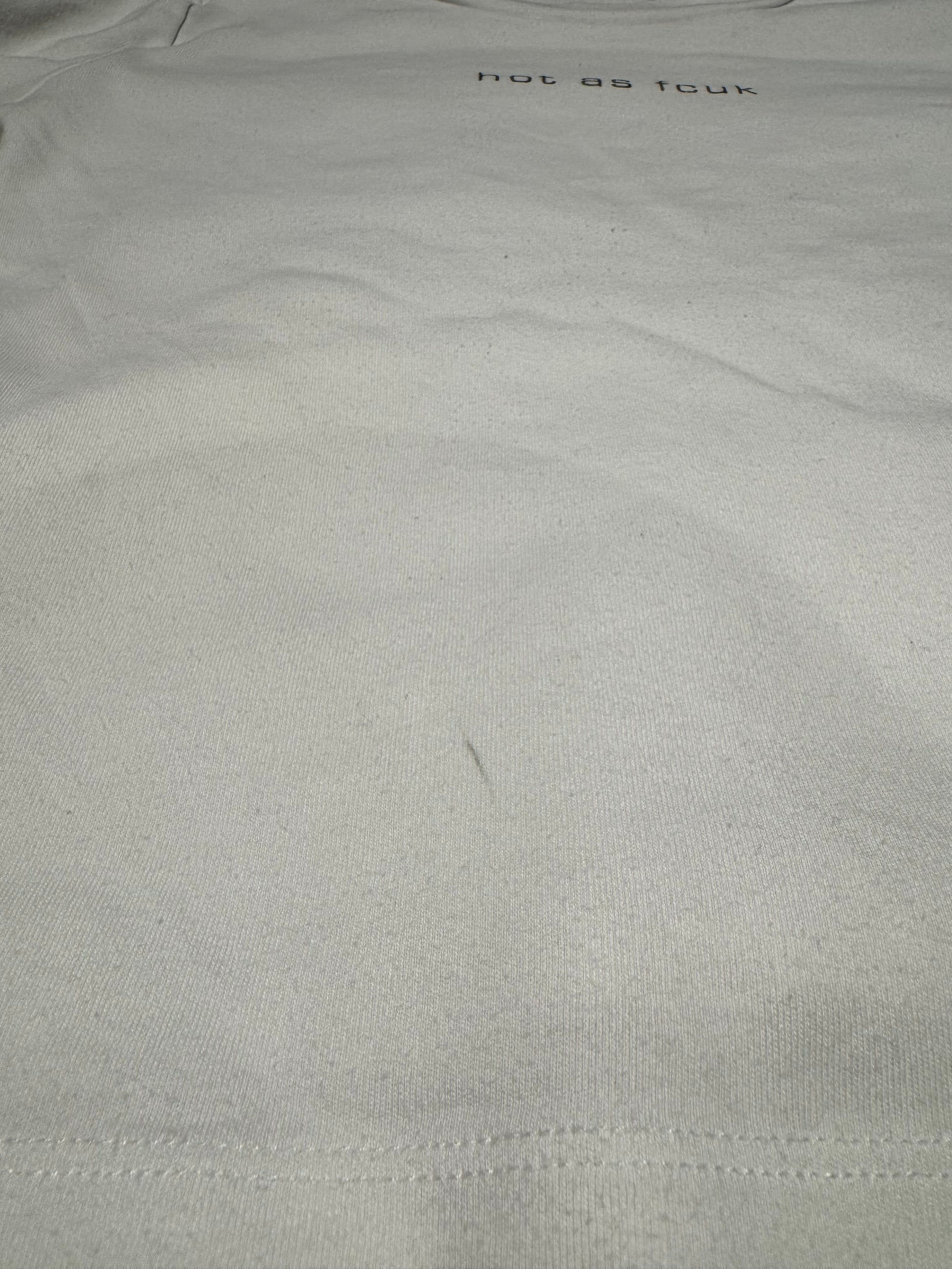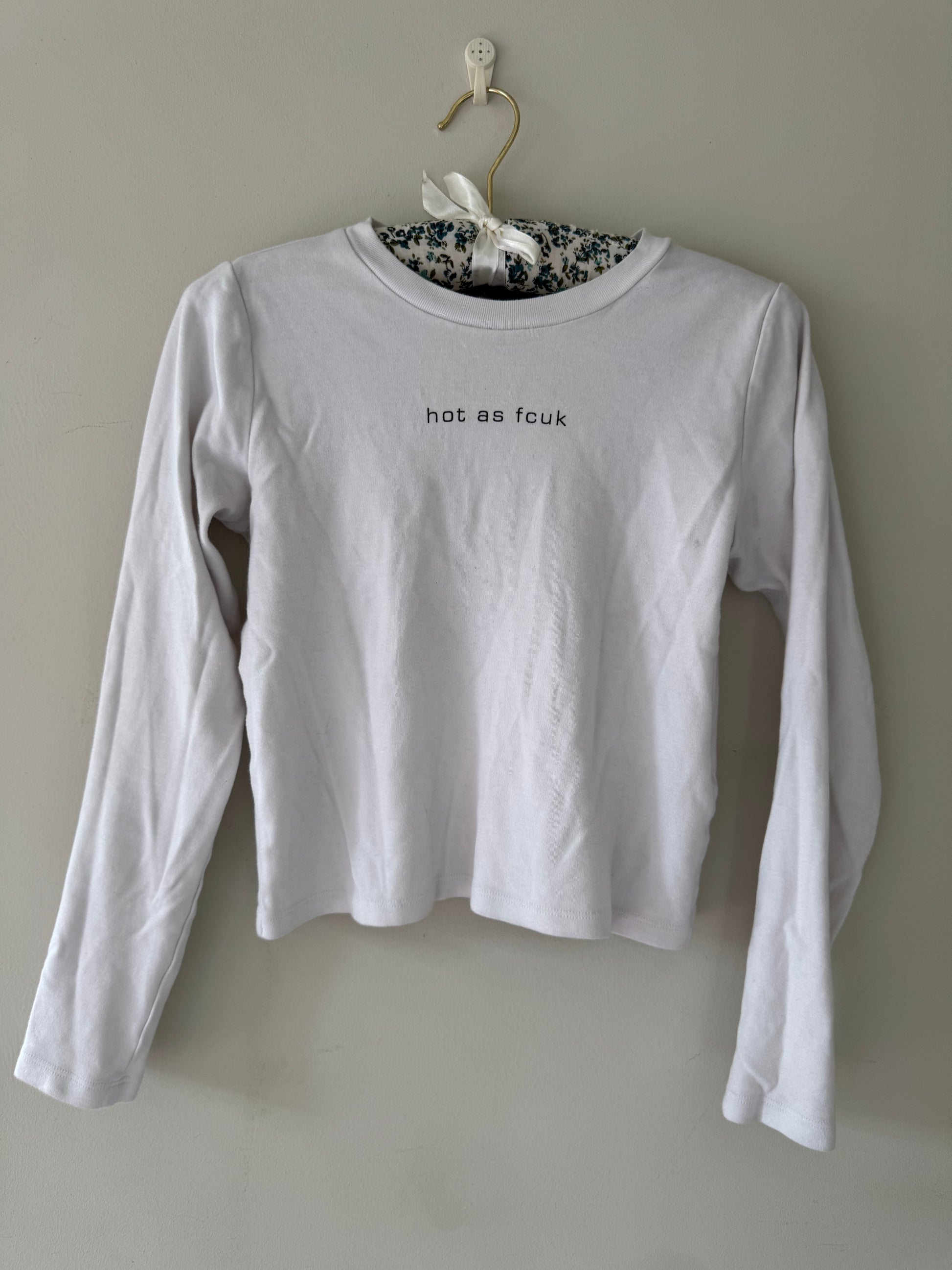 Keep it bold and playful with this white baby tee featuring a cheeky “hot as fcuk” slogan. Designed with a fitted silhouette, long sleeves, and cropped hem, this top brings Y2K vibes with a modern edge. Perfect for pairing with low-rise jeans or layering under oversized jackets for an effortlessly cool look.