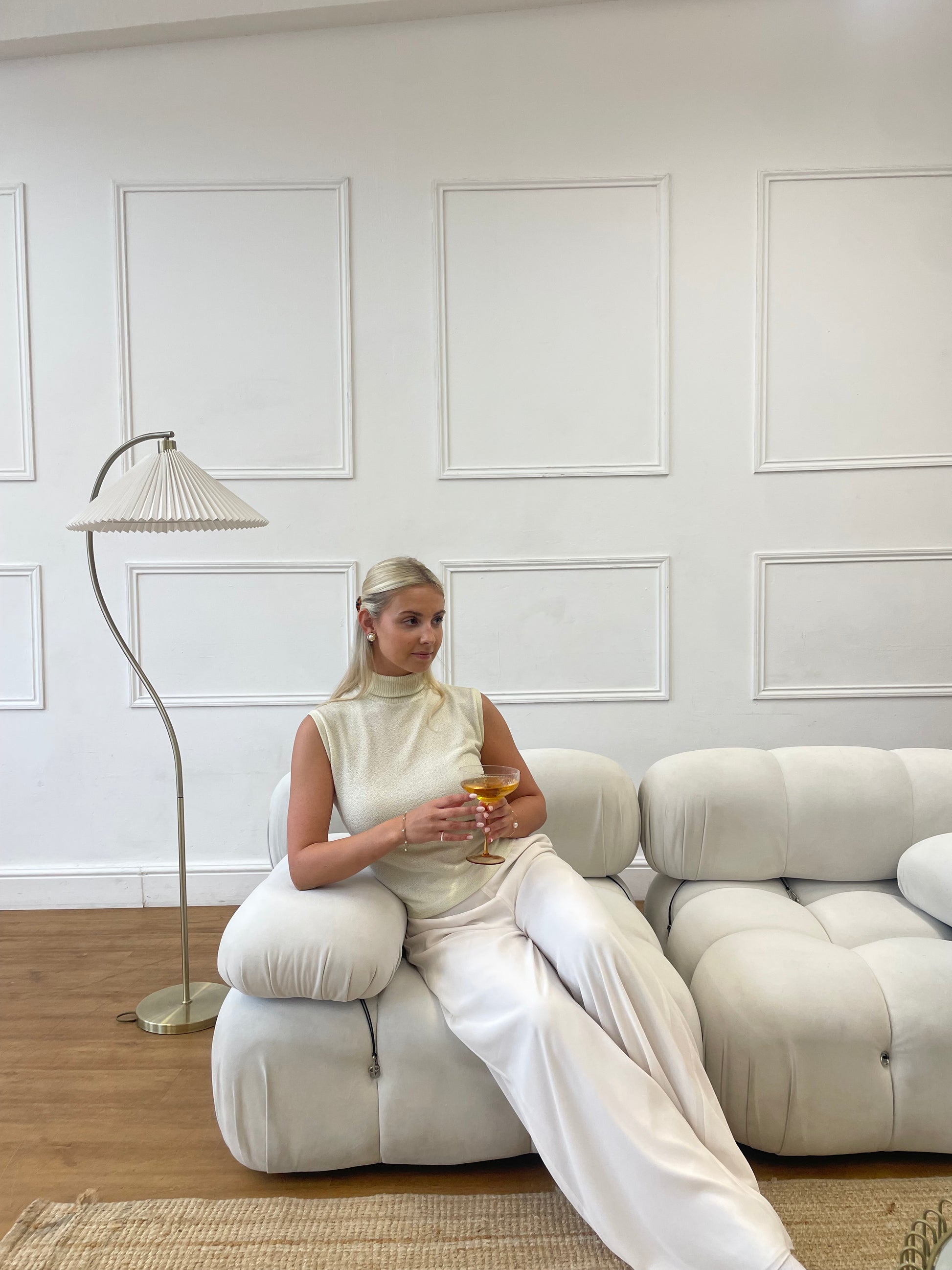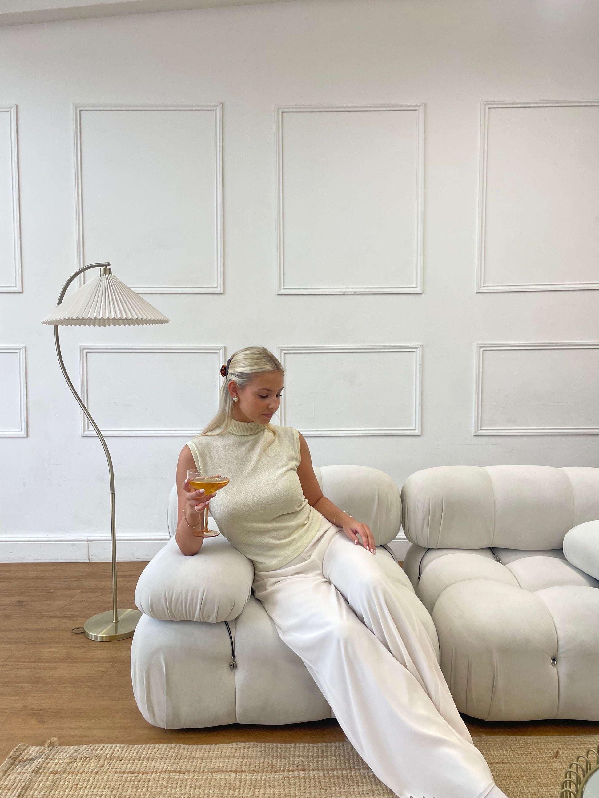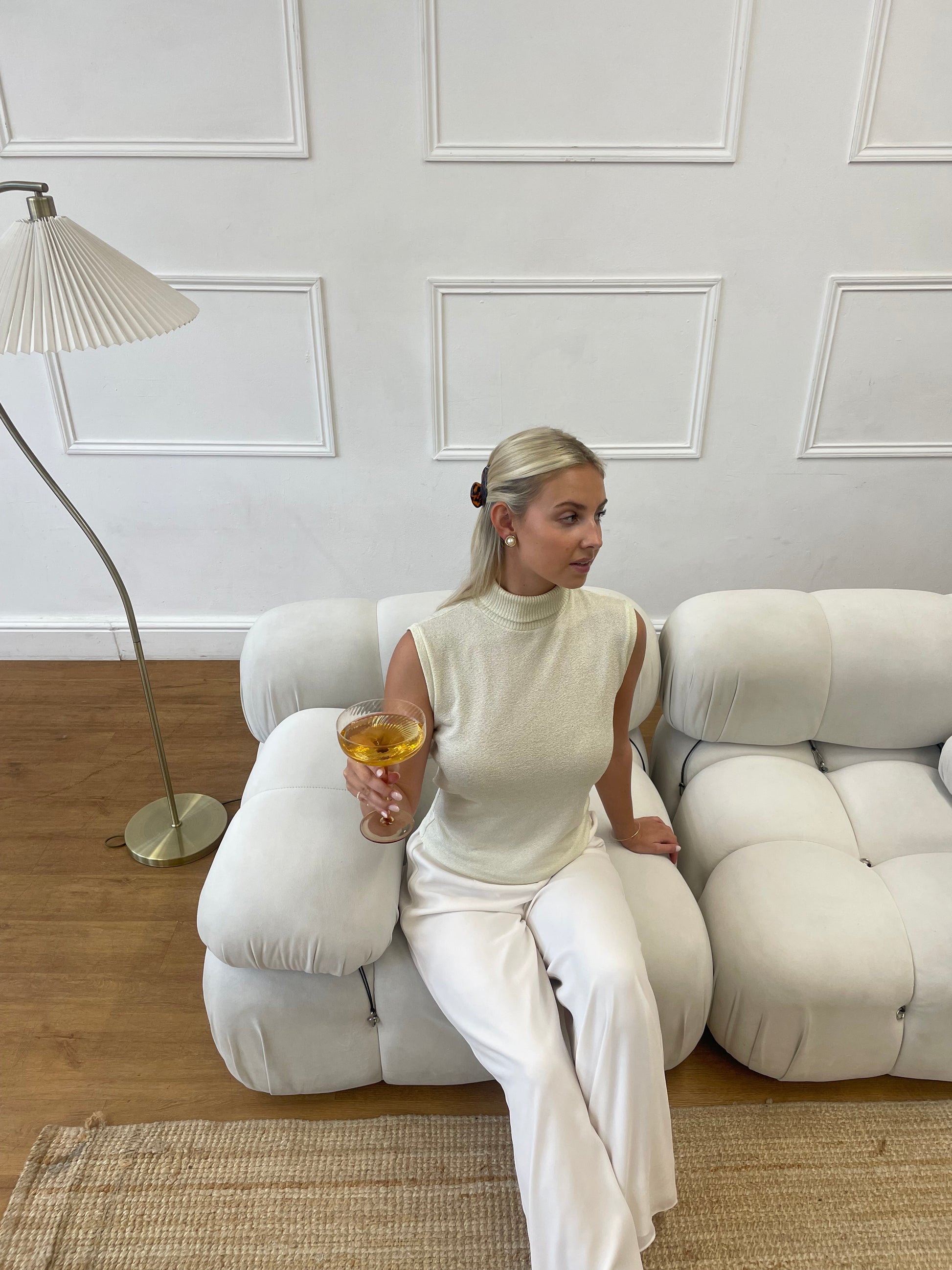 A soft cream-yellow, lightly shimmering high-neck top that adds a warm glow to your festive wardrobe. Its sleek, sleeveless design makes it perfect for layering under blazers or wearing solo for Christmas gatherings and New Year celebrations—minimal, modern, and subtly luminous.